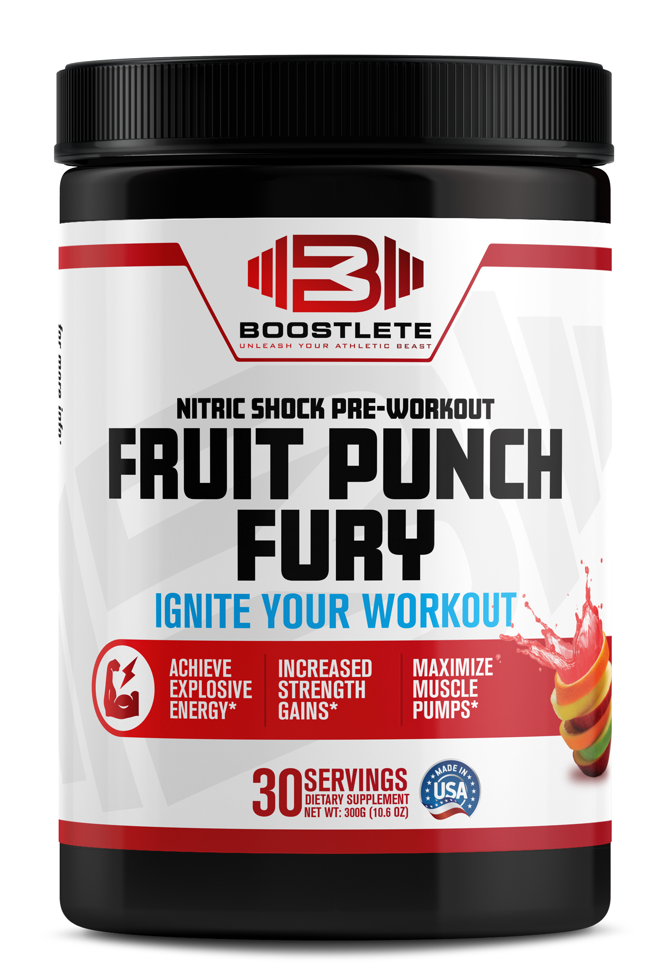 Unleash the ultimate workout companion with Boostlete Nitric Shock Pre-Workout in the invigorating Fruit Punch Fury flavor! Ignite your fitness journey with this meticulously crafted supplement that’s bursting with features to amplify your exercise regimen: